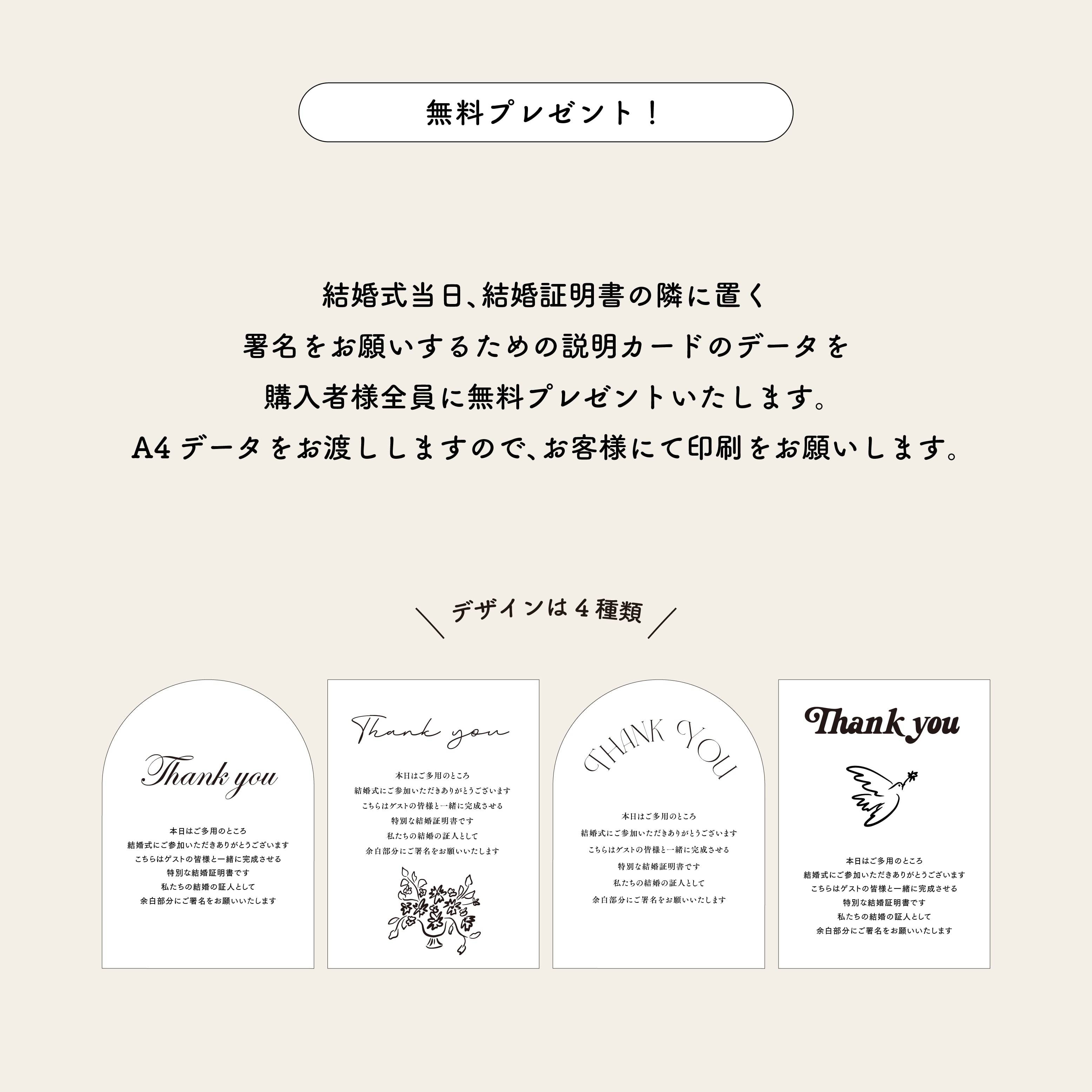 結婚証明書の横に添える説明カードのデータも無料でプレゼントいたします。
