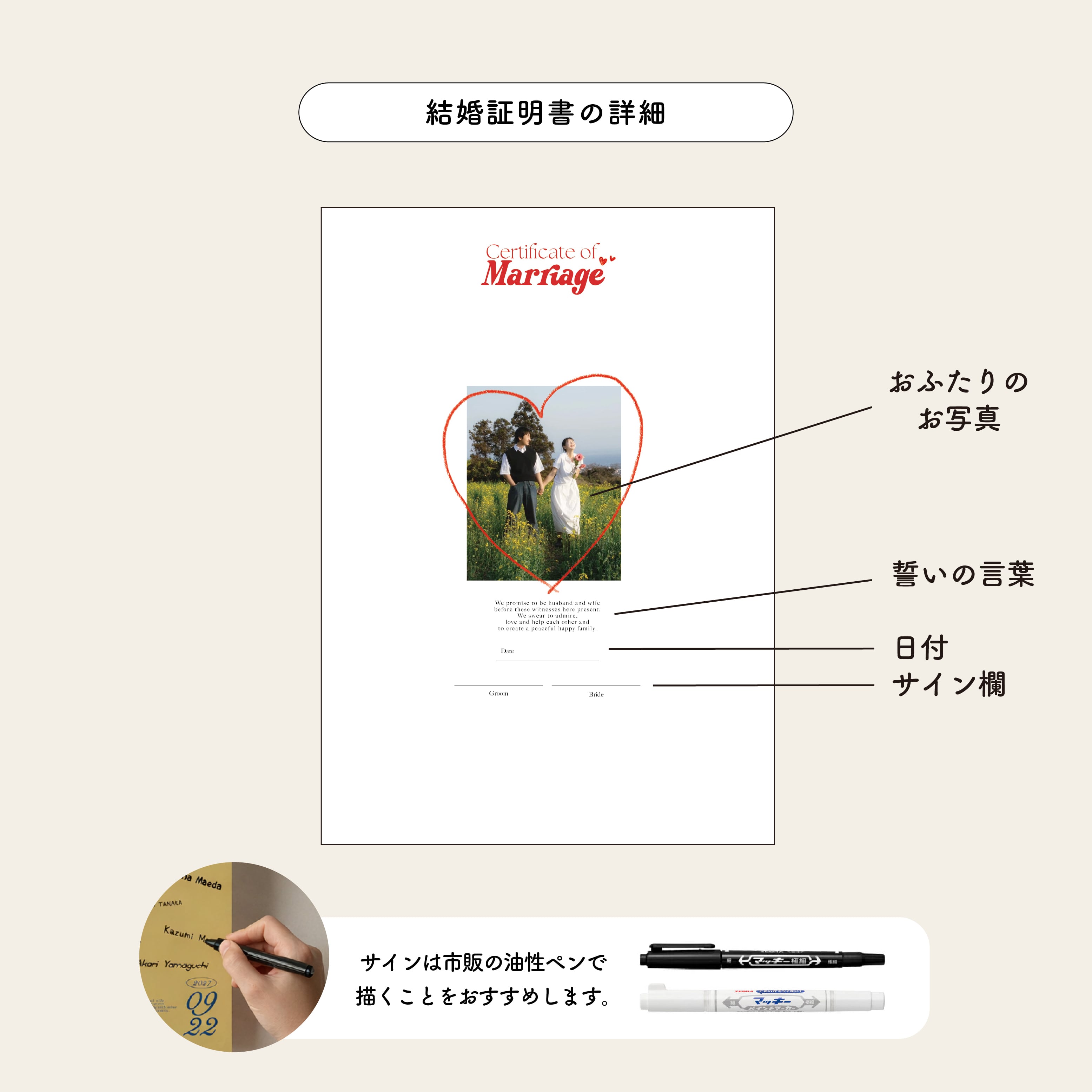 結婚証明書の横に添える説明カードのデータも無料でプレゼントいたします。